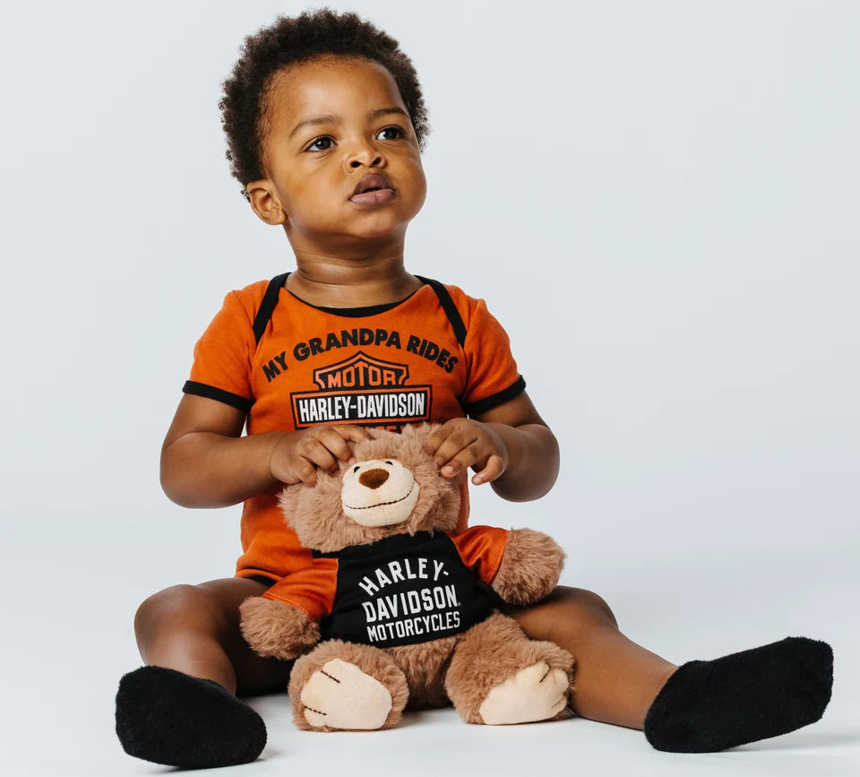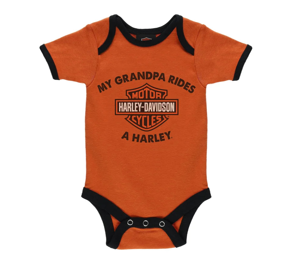 Our must have 2pack Ribbed Bodysuits features the classic My Grandpa Rides A Harley® Graphic with H-D® Bar & Shield screenprinted at front on one, and The iconic Number 1 logo on the other