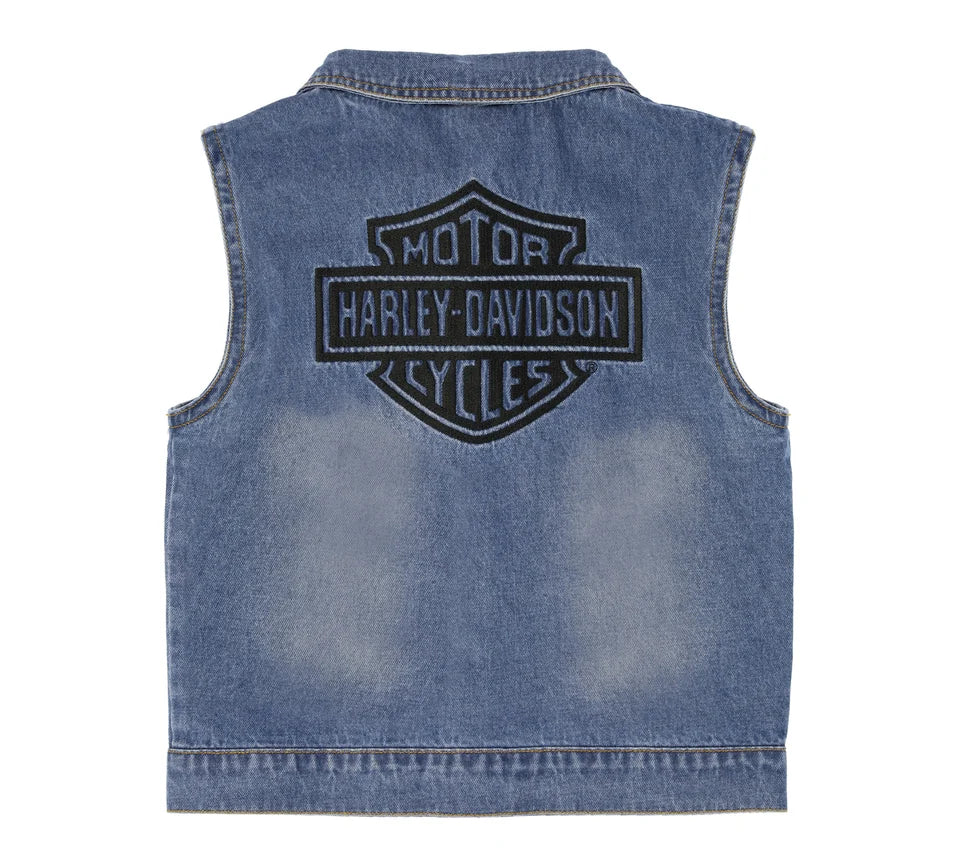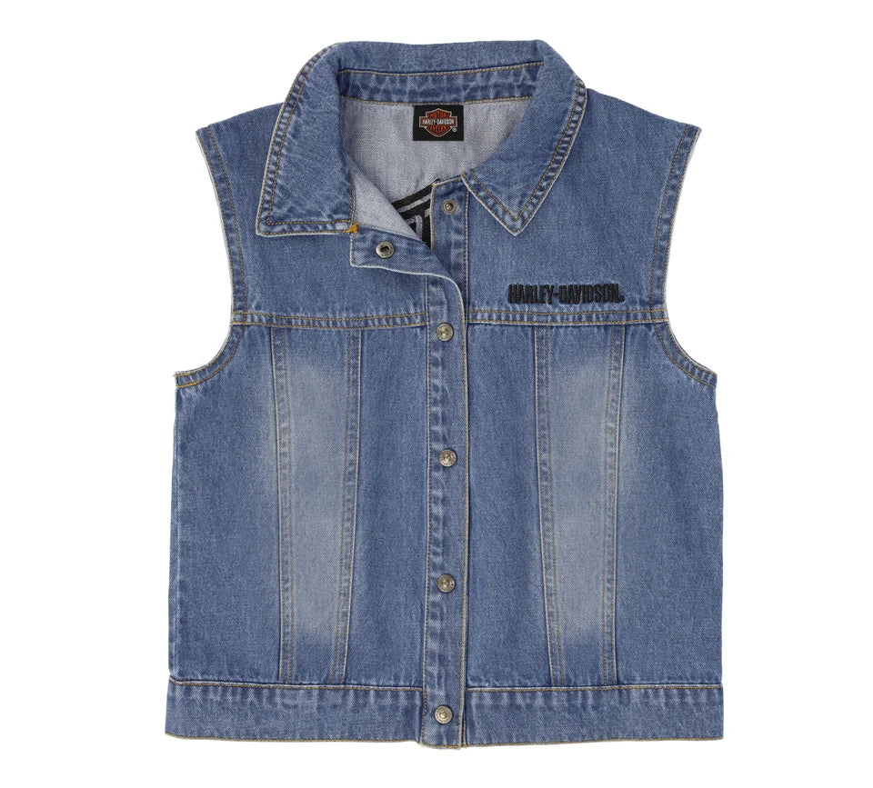 Our unisex enzyme washed blue denim vest, features H-D® logo snaps at front placket. Front is embroidered with an H-D® logo, back has an embroidered Bar & Shield.