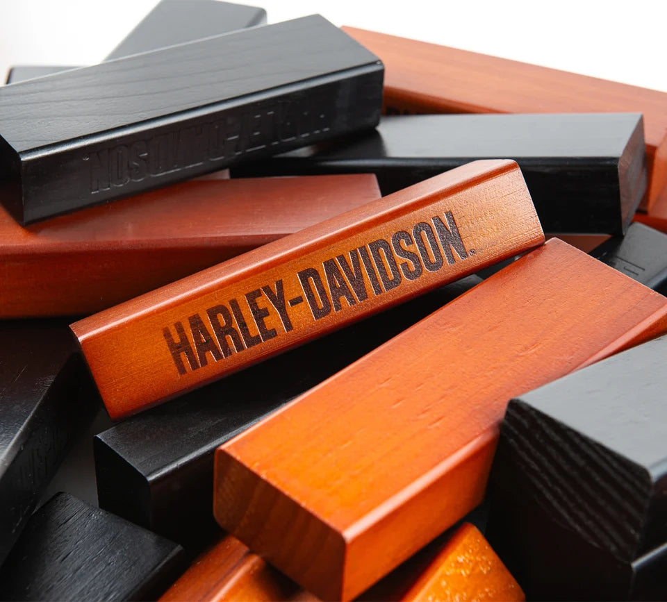 On the road or in the backyard this game truly stacks up! Durable, water-resistant hardwood tower stacker measuring in at over two feet tall! Two-toned and accented with the Harley-Davidson® logo, laser-engraved on each piece. Easily transported with the canvas carrying case.