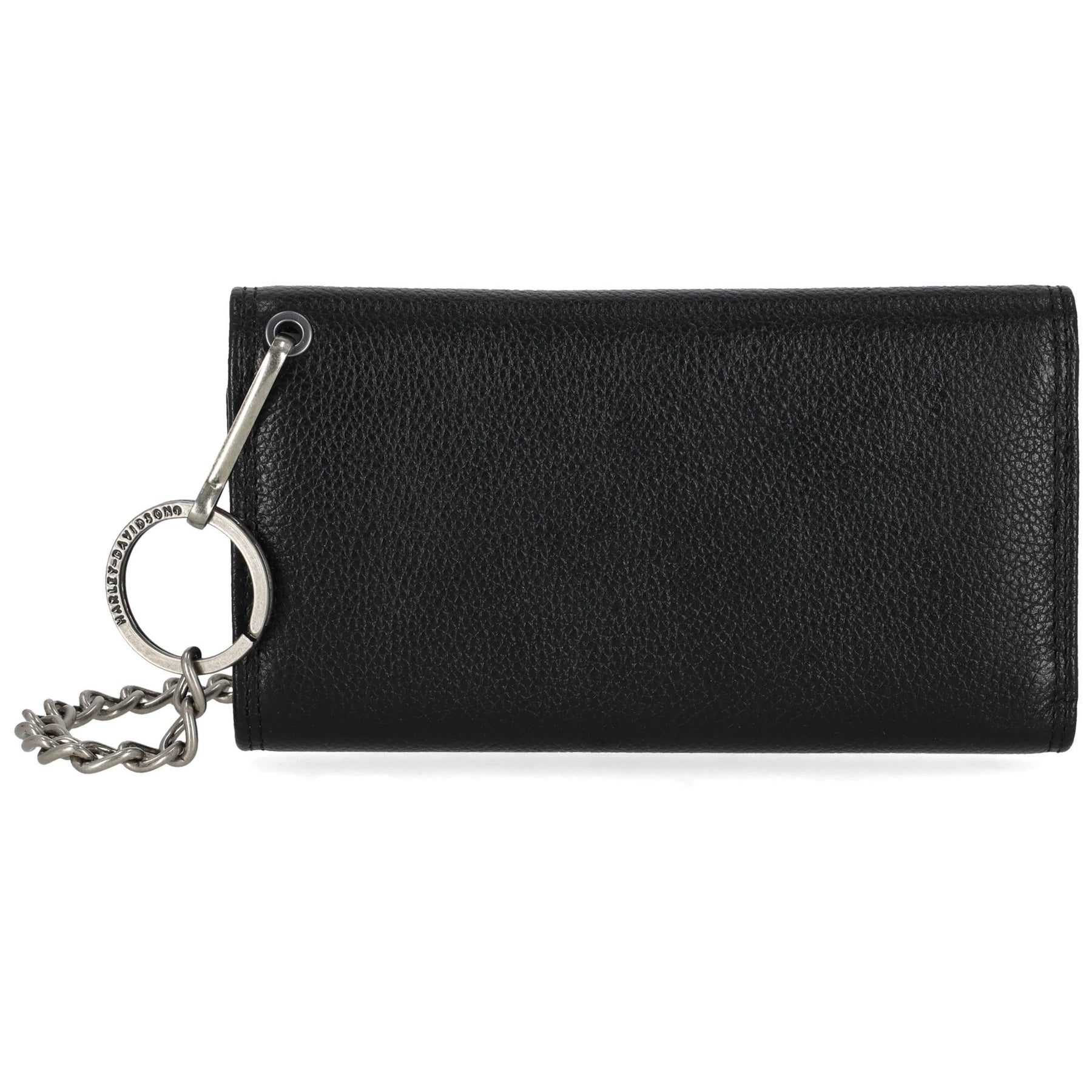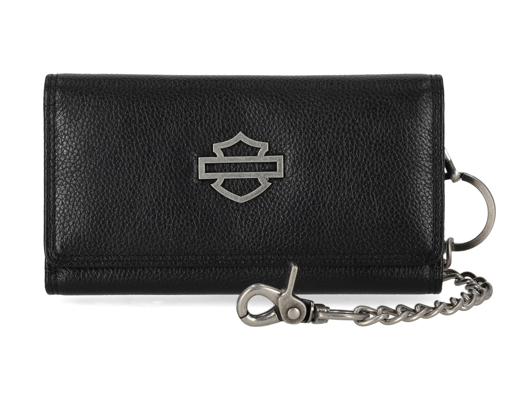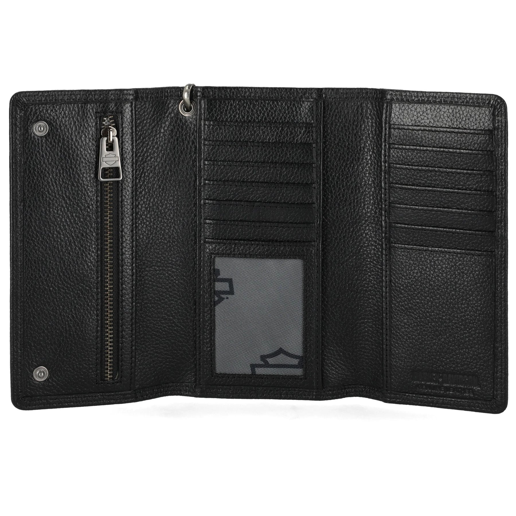 Regular price $107.95Crafted from genuine leather, this Harley-Davidson tri-fold trucker wallet offers RFID protection to keep your information secure. Featuring the iconic Open Bar & Shield metal logo, it combines style with functionality. The wallet includes a snap closure, interior ID window, multiple credit card slots, a zipper pocket, and slip pockets for organized storage. A detachable chain adds convenience and security, making it an essential accessory for the discerning rider.