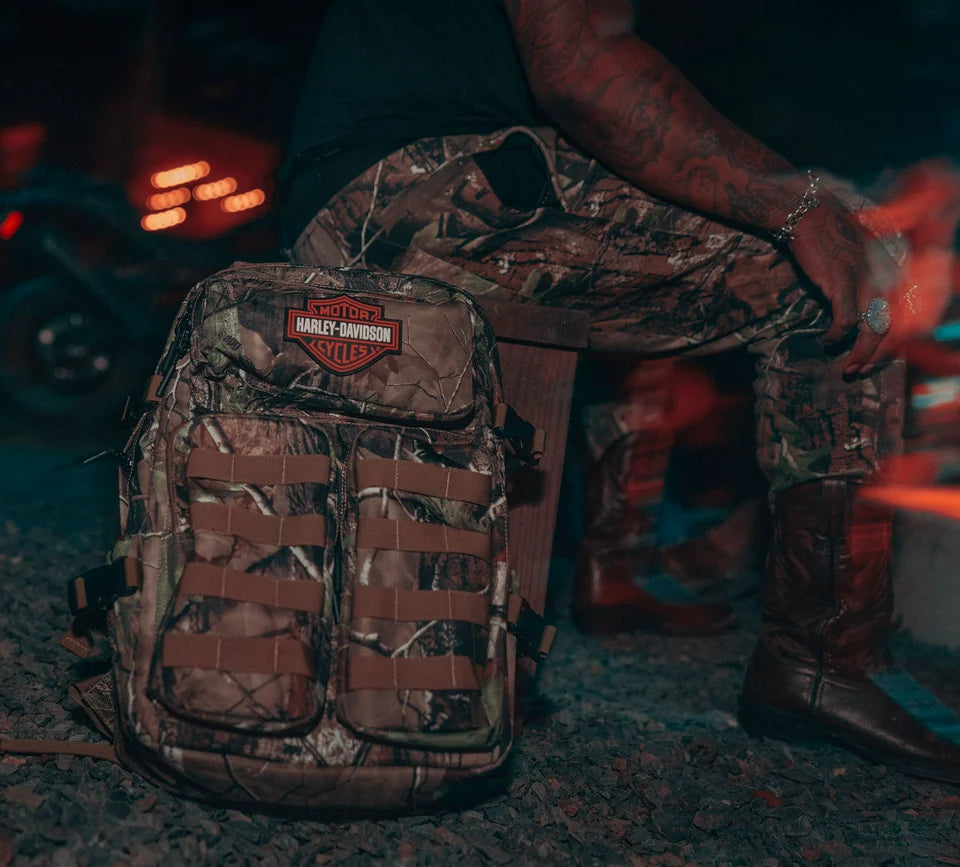 Regular price $169.95Rugged and ready for anything, the H-D Realtree® APG backpack has pockets and loops to hold all your gear, wherever you’re headed. Top zip opens to a roomy, dual-compartment interior with a padded laptop sleeve. Easy-access exterior zip pockets with daisy-chain loops and side elasticized water bottle pockets let you grab essentials on the go. Adjustable compression straps keep everything secure. Breathable mesh back and adjustable shoulder straps make it comfortable to carry.